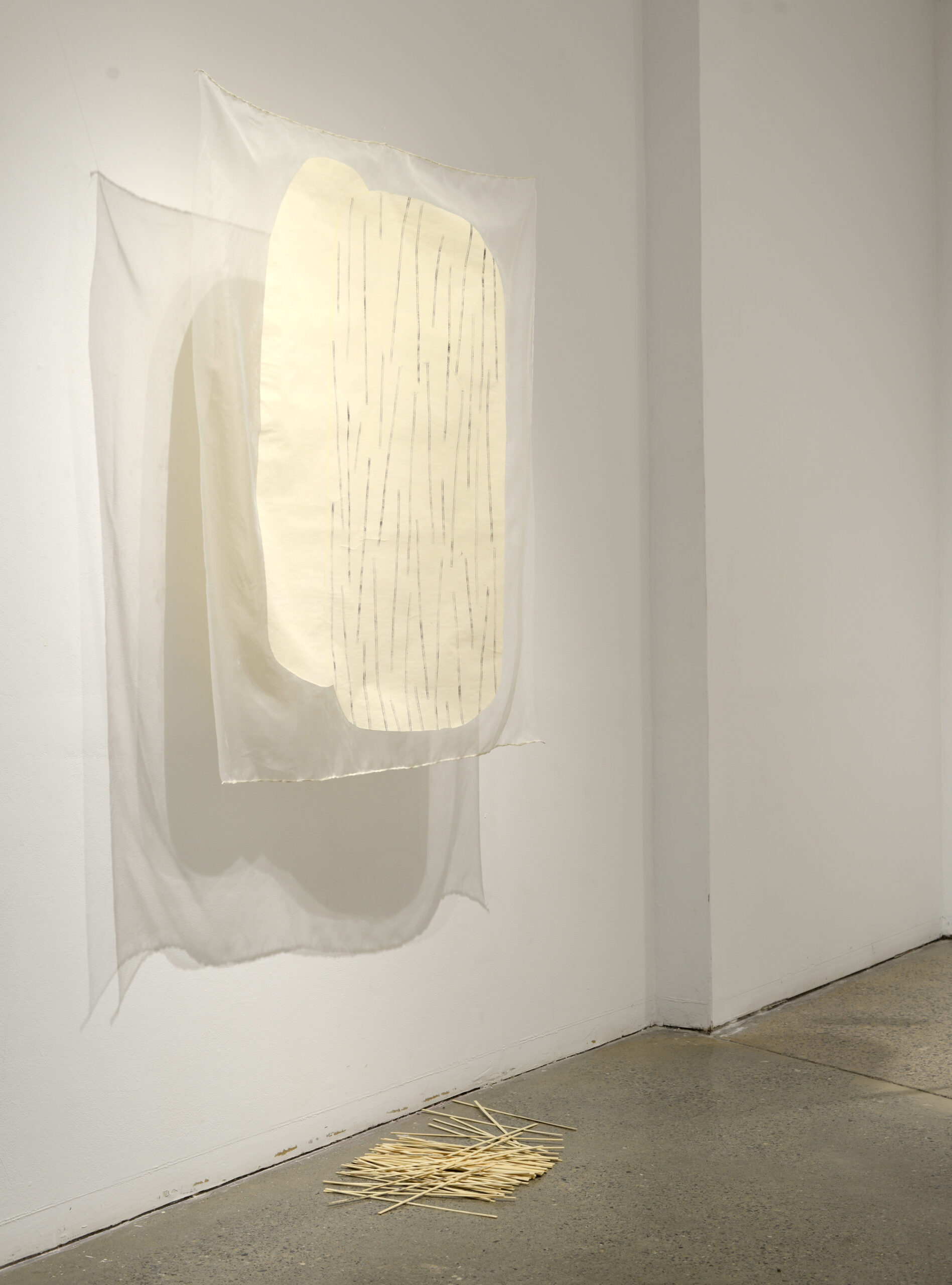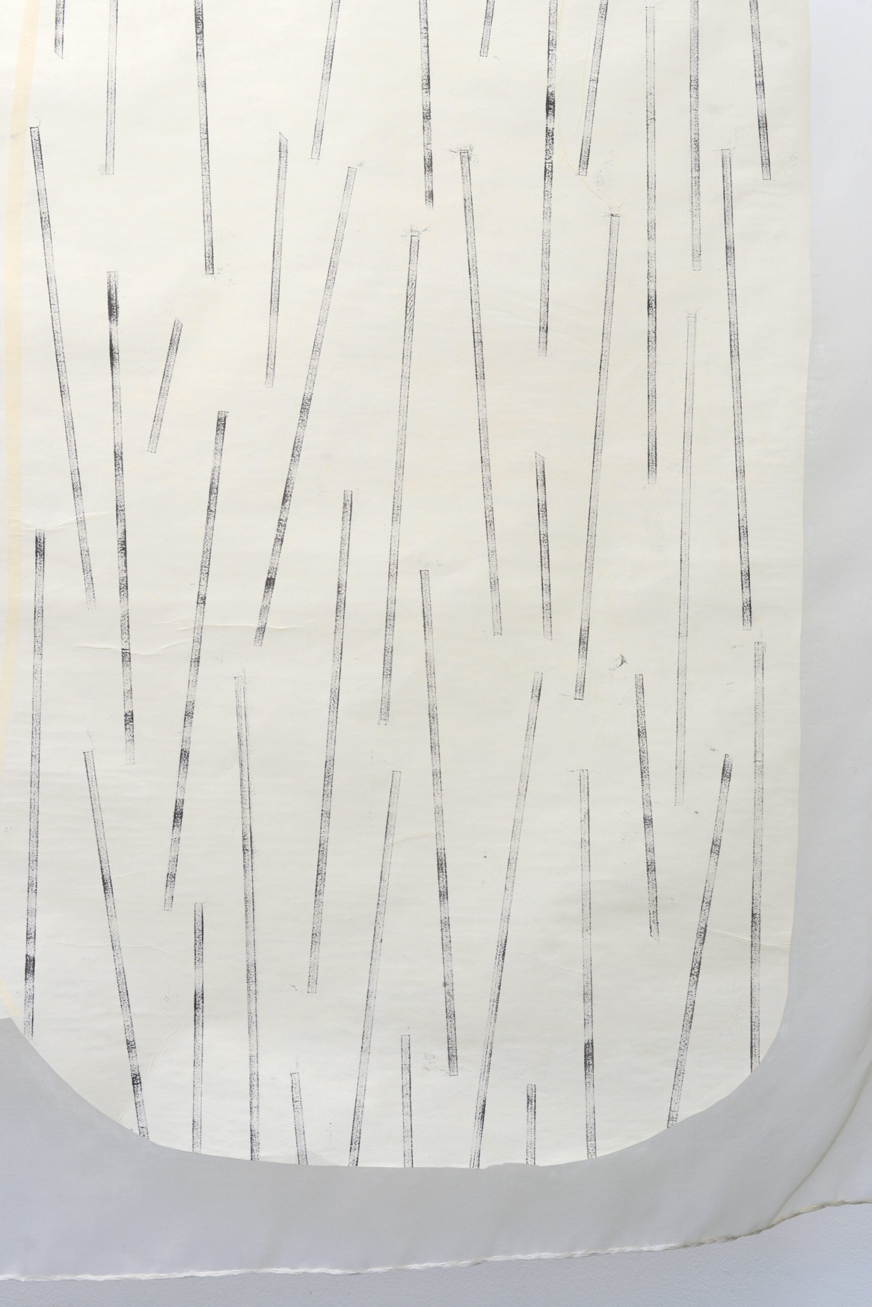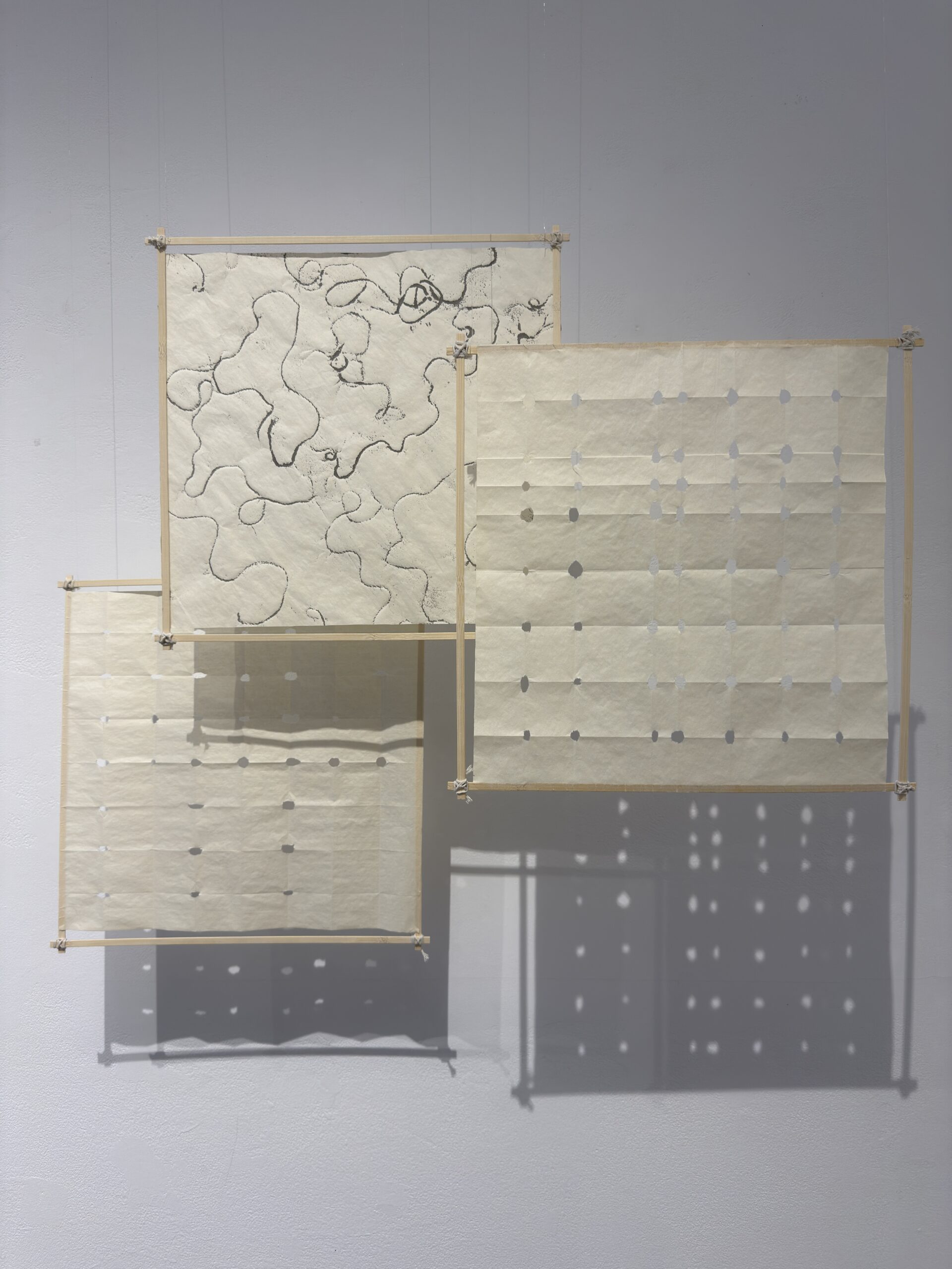 The installation includes Xuan paper with ink rubbings, recycled hemp strips, and bamboo. The hemp strips, once used to tie bamboo structures, retain the memory of labour in their unruly curves. Reconfigured here, they no longer serve a utilitarian purpose but instead embody traces of time, touch, and transformation.