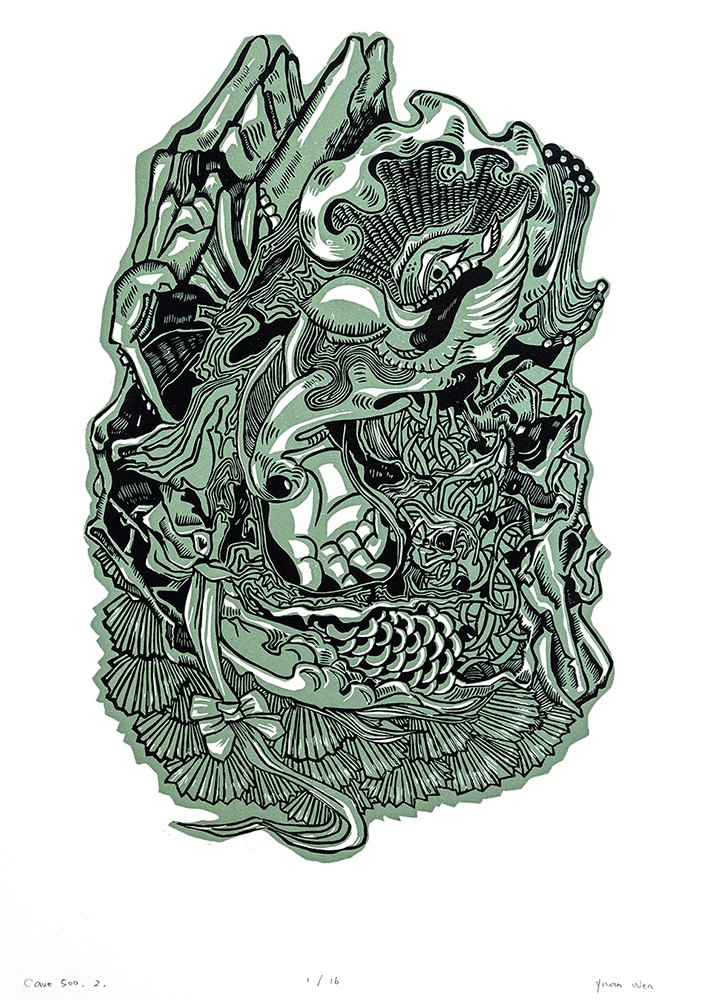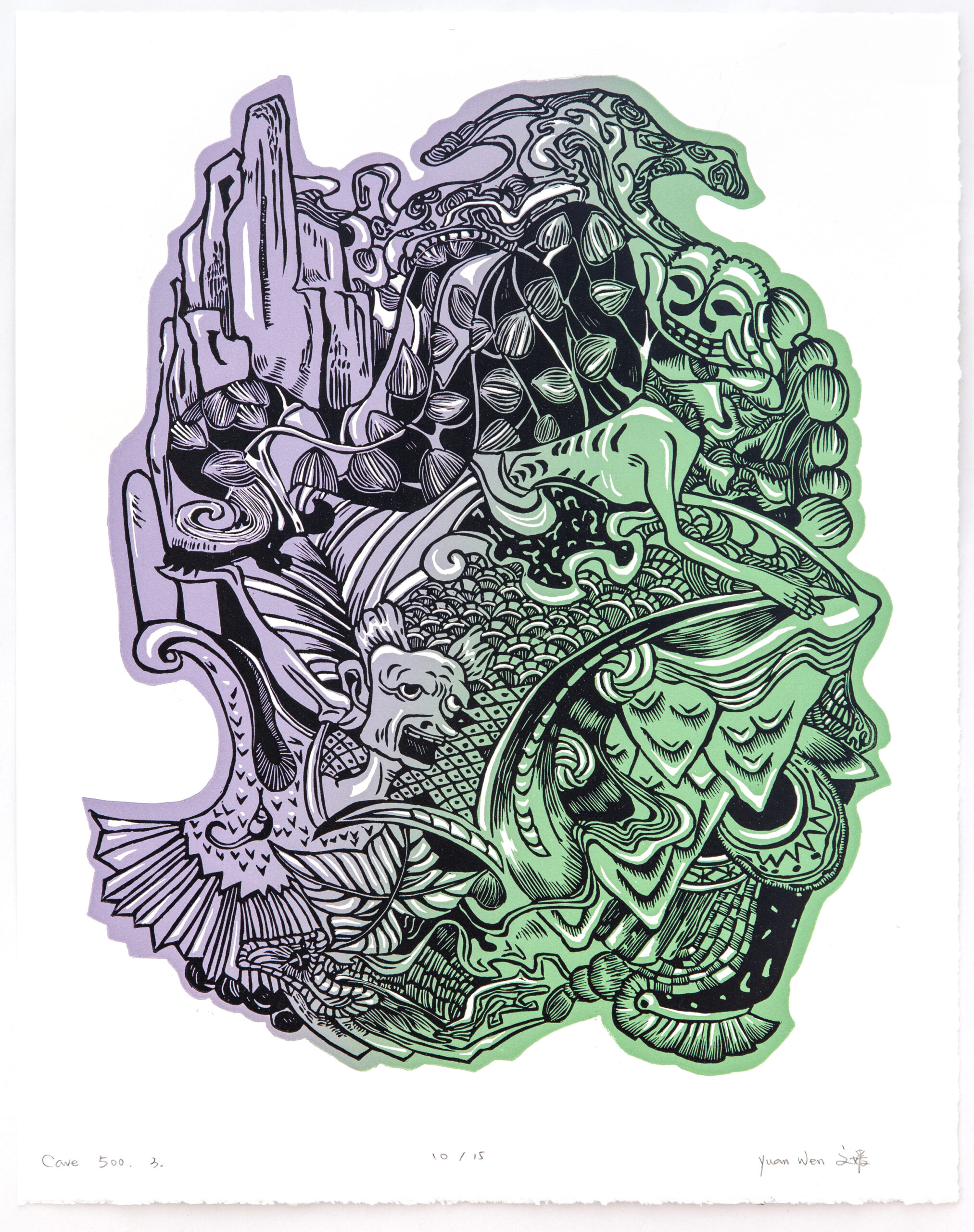 This ongoing project is focused on my research into the Mogao Caves in Dunhuang, an oasis situated at a religious and cultural nexus on the Silk Road in China. My work is a synthesis of symbolic elements from Dunhuang murals and my contemplations on multiculturalism and ancient art. Given that there are 492 caves in Dunhuang, I have titled this series “Cave 500”.